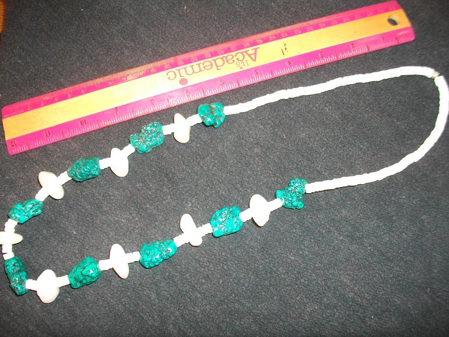 34. Turquoise nuggets with tumbled white agate. Rough white shell heishi.