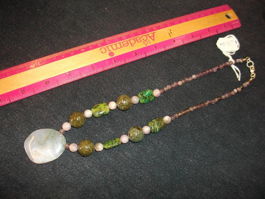32. Clearish moss agate pendant is 1 1/2". Flat rectangular chrysocholla,