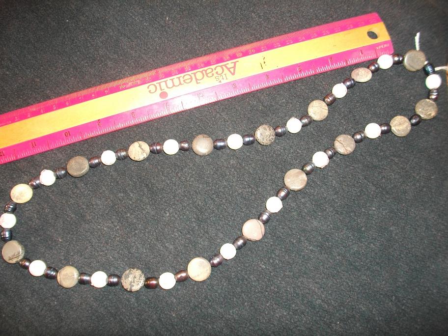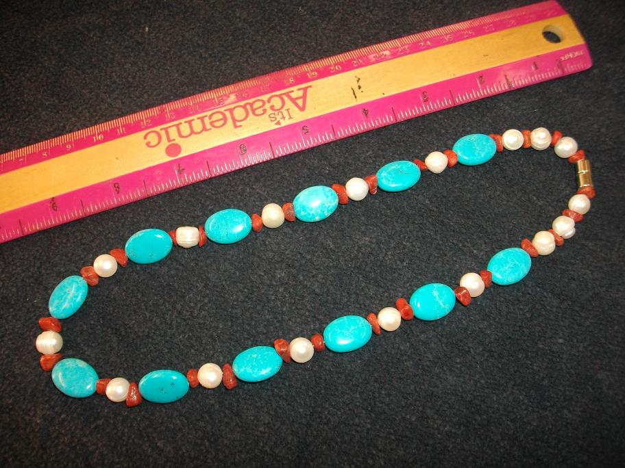 28. Chalk turguoise ovals and white freashwater pearls spaced with sponge coral chips.