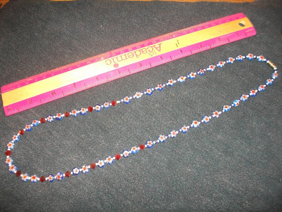 29. Red, white and blue glass millefore coins with siam red Swarovski bicones and