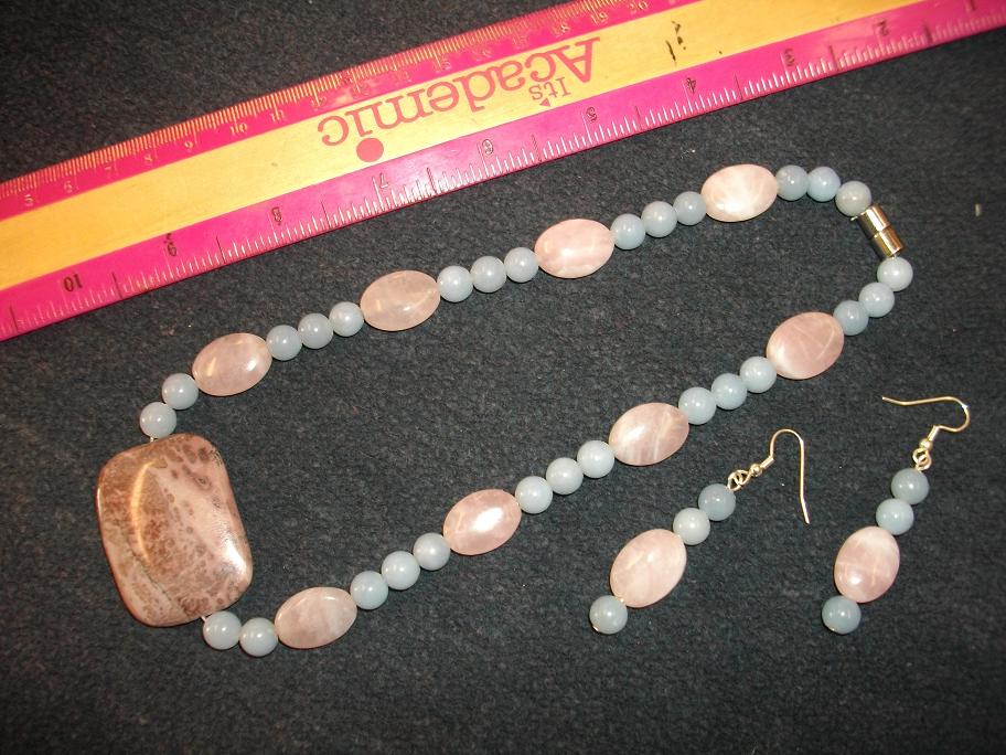 1. Rose quartz ovals and blue angelite rounds. leads to a crazy horse pendant sized rectangle focal.